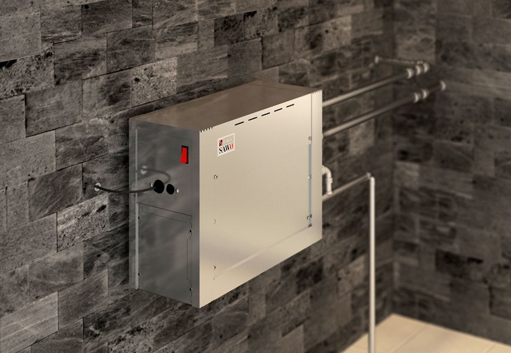 - Proximity to Steam Room: Install the steam generator as close as possible to the steam room to minimize plumbing runs and heat loss in steam delivery. SAWO recommends a maximum of 7.5m from the steam room outlet in the room. Common locations are nearby utility room, laundry, basement or outside wall (if installed outside a waterproof cover with adequate ventilation will be required to ensure the unit does not get wet).